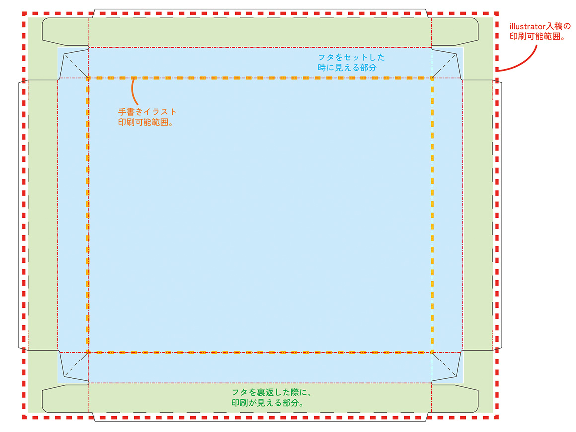 - 手描きイラスト入稿の場合は表面(横257mm×縦205mm)の範囲に印刷します。